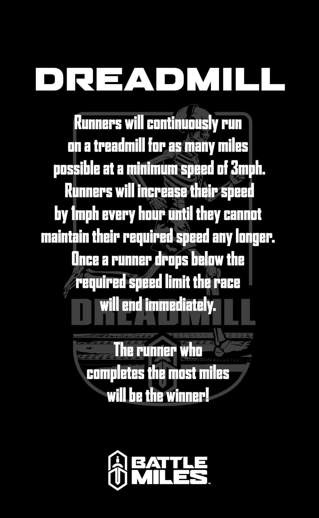 Welcome to Battle Miles first ever treadmill race, Dreadmill! Runners will continuously run on a treadmill for as many miles possible at a minimum speed of 3mph. Runners will increase their speed by 1mph every hour until they cannot maintain their required speed any longer. Once a runner drops below the required speed limit the race will end immediately. The runner who completes the most miles will be the winner!