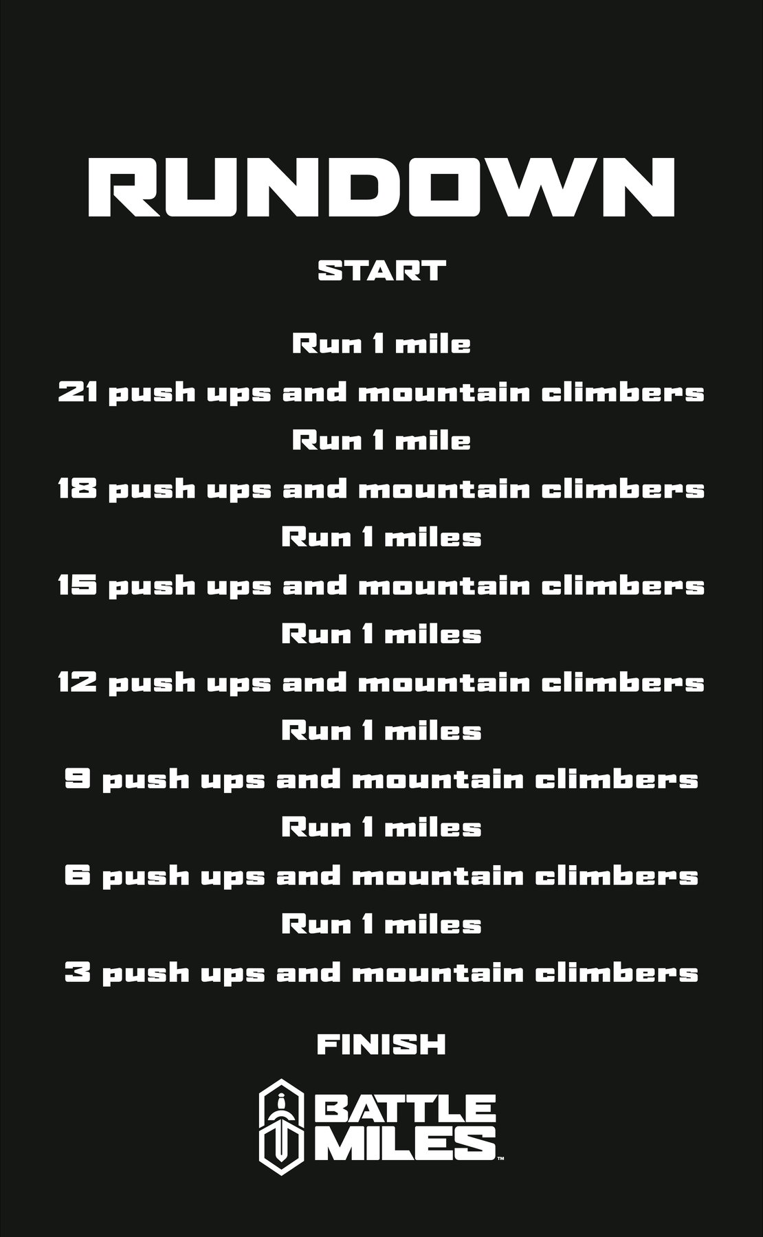 Introducing Rundown! Run 7 miles while performing push ups and mountain climbers every mile. The reps decrease by 3 every mile (21, 18, 15, 12, 9, 6, 3).